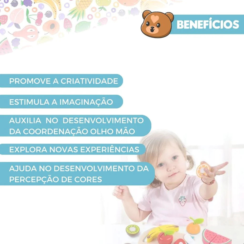 - Desenvolvimento Motor e Cognitivo: Aprimore a coordenação motora fina ao "cortar" e juntar as frutas com velcro, desenvolvendo habilidades de reconhecimento de cores, formas e texturas.