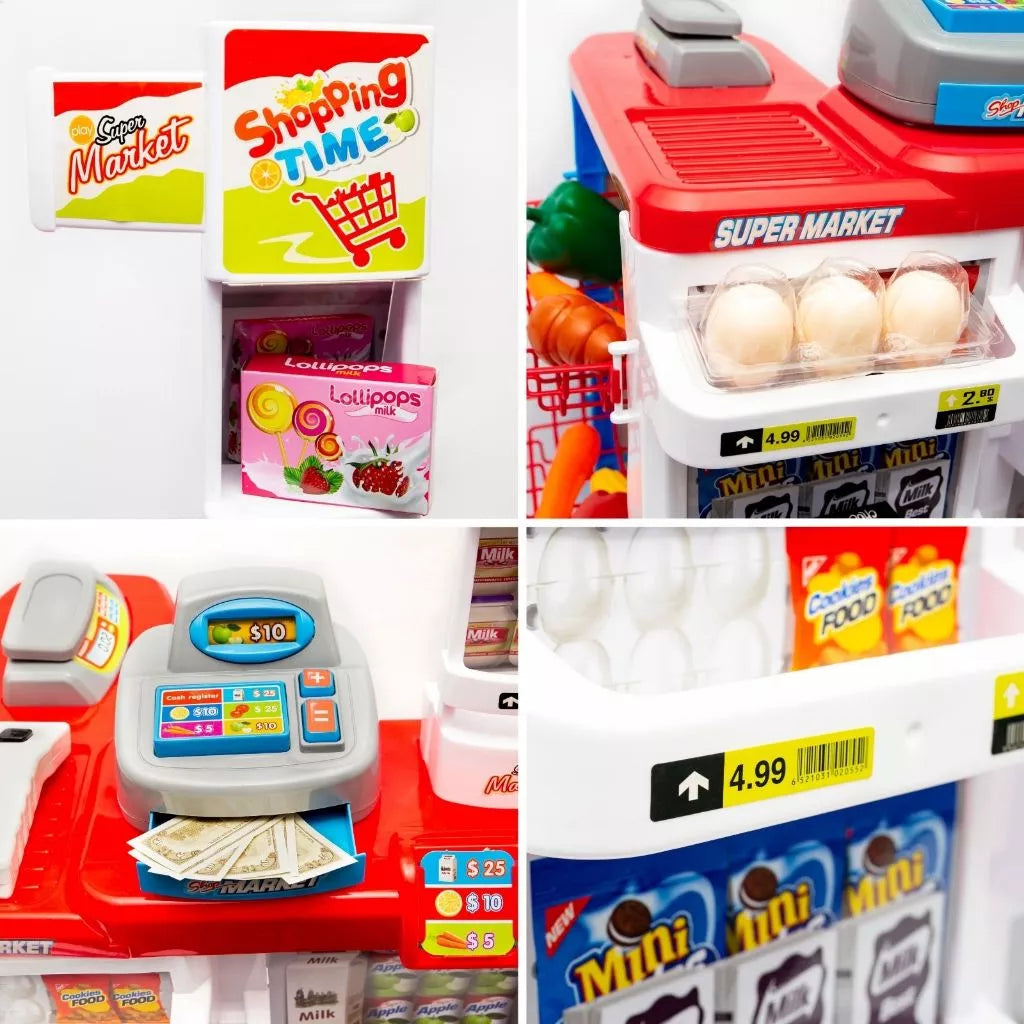 • Experiência de Supermercado Realista: As crianças se sentirão verdadeiros compradores e vendedores em um mercadinho rico em detalhes, com tudo o que precisam para simular transações e organizar produtos.